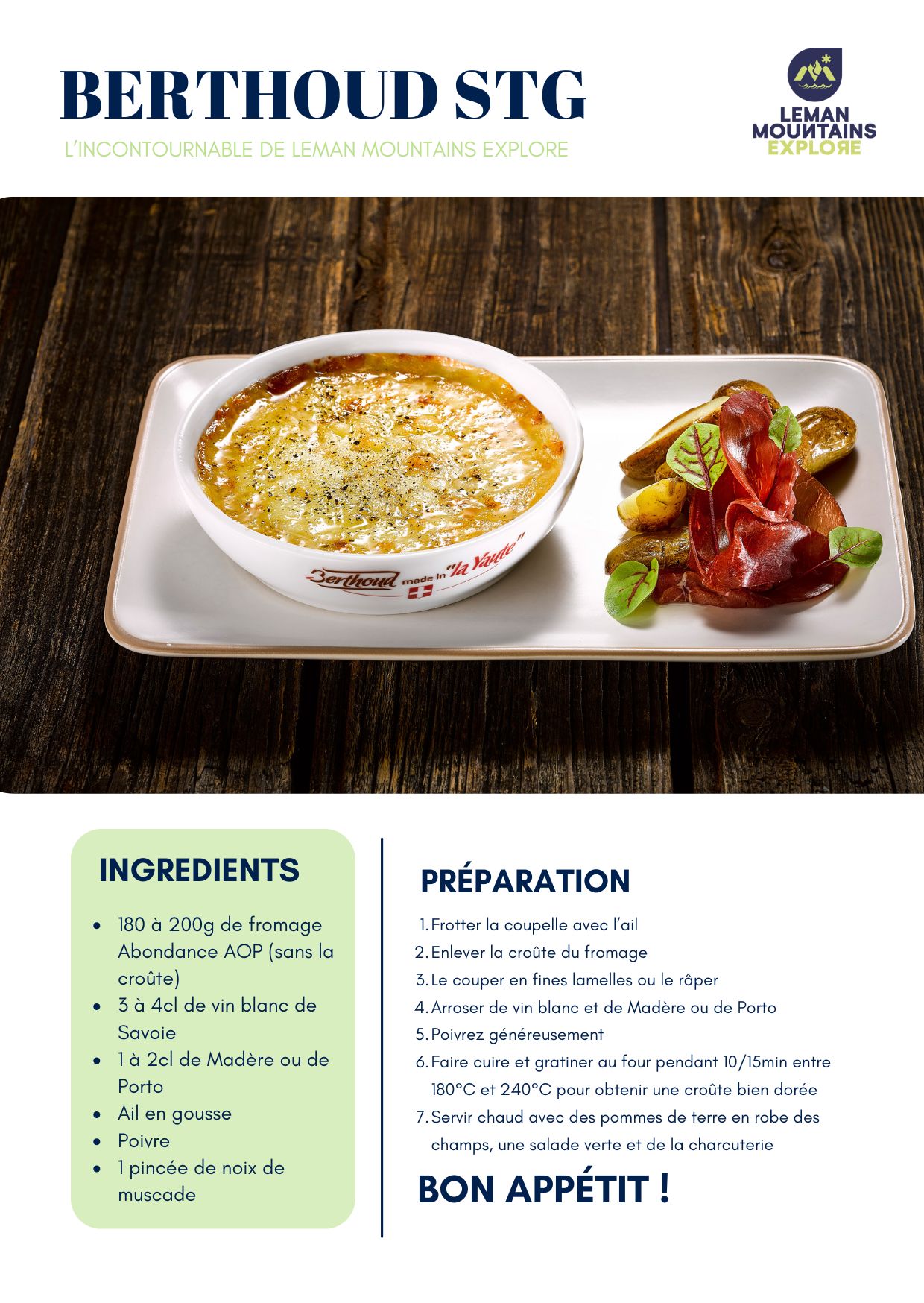 Abondance lends itself to a wide range of culinary preparations, from simple cheese platters to more elaborate recipes. The most famous speciality is Berthoud, a local recipe based on melted Abondance cheese, au gratin and served with bread or potatoes.