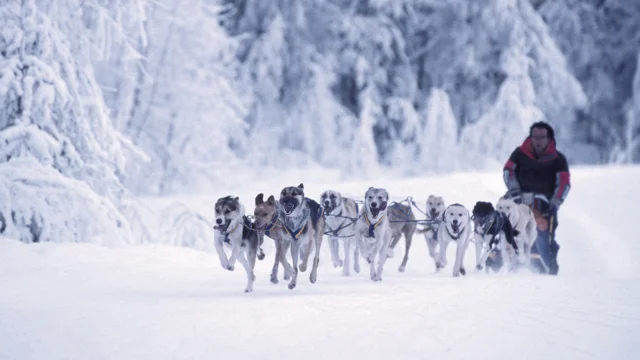 Comfortably seated in the sled pulled by a dozen dogs, you can enjoy the scenery. The musher guides you and explains the life of the pack.