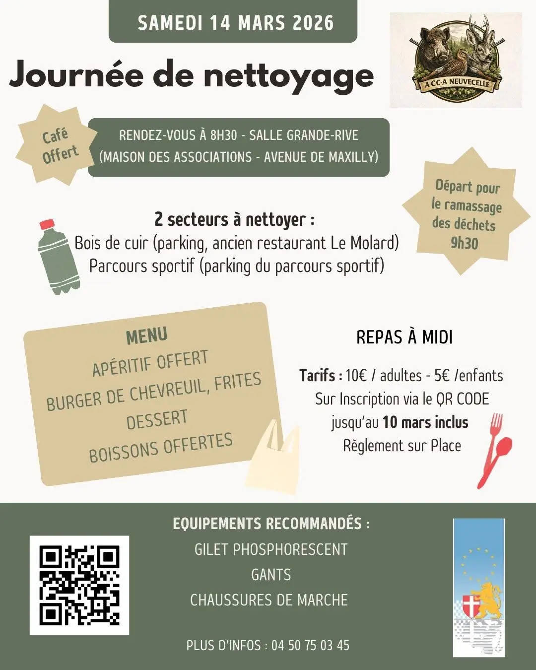 De ACCA-vereniging van Neuvecelle organiseert een opruimdag! Reserveer zaterdag 14 maart om deel te nemen aan de schoonmaak van het leerbos en het lokale sportpad! s Middags wordt er een maaltijd geserveerd (reserveren via QR-code).