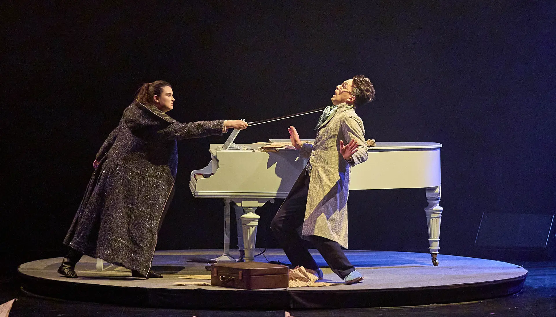 Après leur précédent triomphe sur la scène du Théâtre Novarina en 2023, le duo de pianistes illusionnistes revient En pleine tempête. Pour ce nouveau chapitre, les frères Cadez ouvrent leur univers, et leur porte, à un troisième personnage, une violoniste aussi redoutable que fascinante… Alors que dehors les éléments se déchaînent, l’étrangère souffle un vent nouveau sous le toit des Virtuoses, mettant à rude épreuve les deux compères qui rivalisent de ruse pour dompter la vague qui s’annonce. Mais qui, des pianistes ou de la violoniste, parviendra à imposer son tempo final ? Entre désaccords savoureux et instants de pure poésie, cet improbable trio, inspiré par le cinéma muet et le burlesque, nous emporte dans une folle épopée, aux confins de la musique et de l’imaginaire.