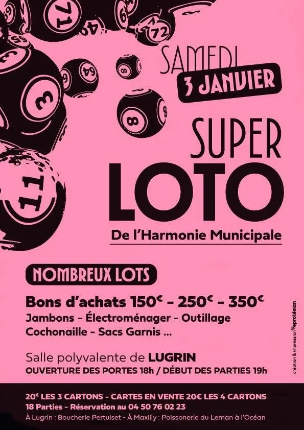 Ne manquez pas le Super Loto de l'Harmonie de Lugrin et tentez de gagner de nombreux lots : bons d'achats, électroménager, outillage, sacs garnis, jambons...